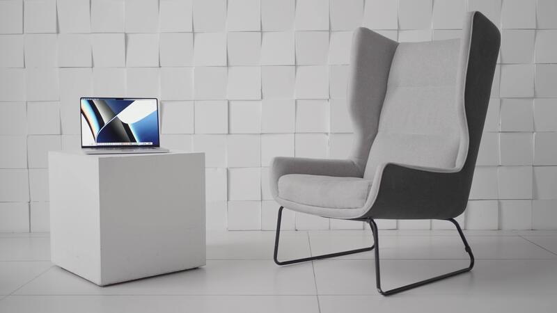 Laptop on a cubic shaped coffee table in a modern office. Action. Minimalistic design of the room with a comfortable chair and a computer on a small table. Pro Video