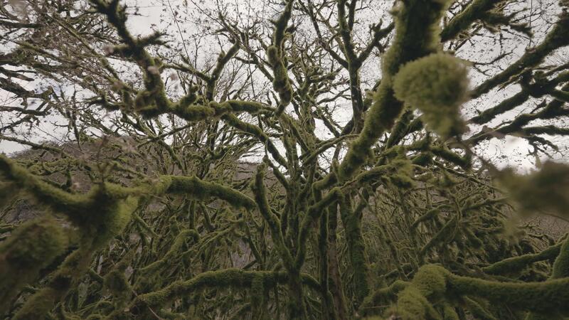 Big long branches. Action. A green tree twisted with bark whose branches are twisting and very long and on which small leaves. Pro Video