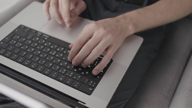 Laptop keyboard. Action. A person sits at a computer and works in modern conditions, close shooting of the keyboard and the printing process. Pro Video