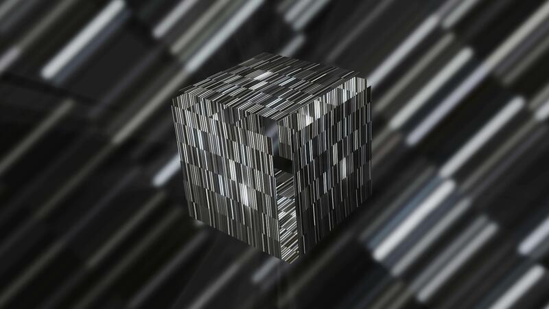 Futuristic black and white cube. Motion. Shimmering striped cube in cyberspace. Mysterious 3D cube is revealed in virtual space Pro Video