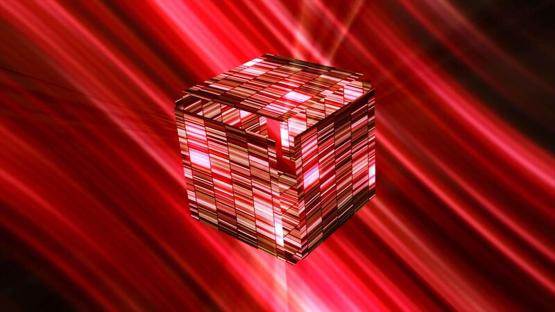 Futuristic glowing cube on striped background. Motion. Glowing striped cube on background of colorful lines. Futuristic cube hanging in cyberspace Pro Video