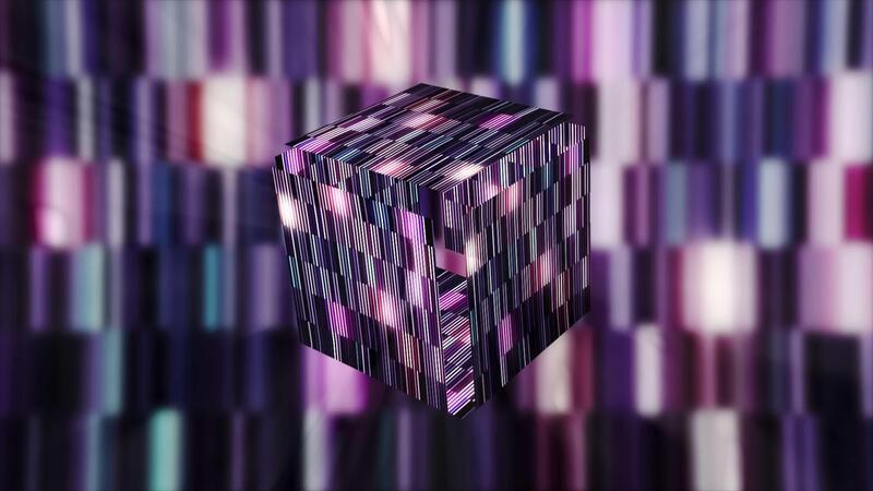 Shimmering 3D cube in cyberspace. Motion. Bright striped cube shimmers on striped background. 3d cube glows in cyberspace Pro Video