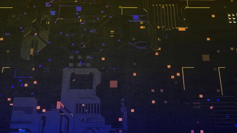 Impressive animation shows data flow in a motherboard in pc. Motion. Highlighted processor among circuits and electronic components, concept of digital communication. Pro Video