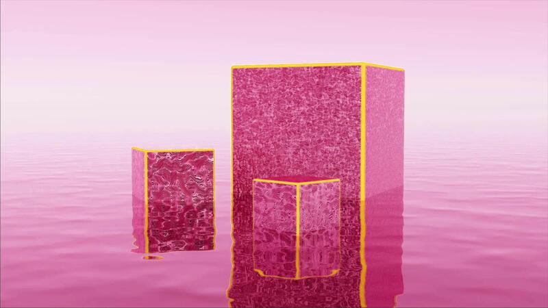 Abstract colorful background with bright three cubes standing on water surface. Design. Pink 3D cubic figures with rough surface in surreal landscape. Pro Video