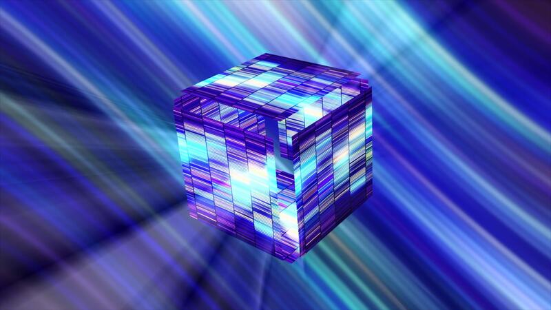 Futuristic glowing cube on striped background. Motion. Glowing striped cube on background of colorful lines. Futuristic cube hanging in cyberspace Pro Video