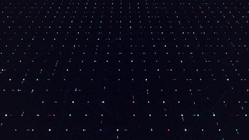 Abstract digital lines randomly moving among spots in a dark technological space. Animation. Flowing narrow stripes in a grid, seamless loop. Pro Video