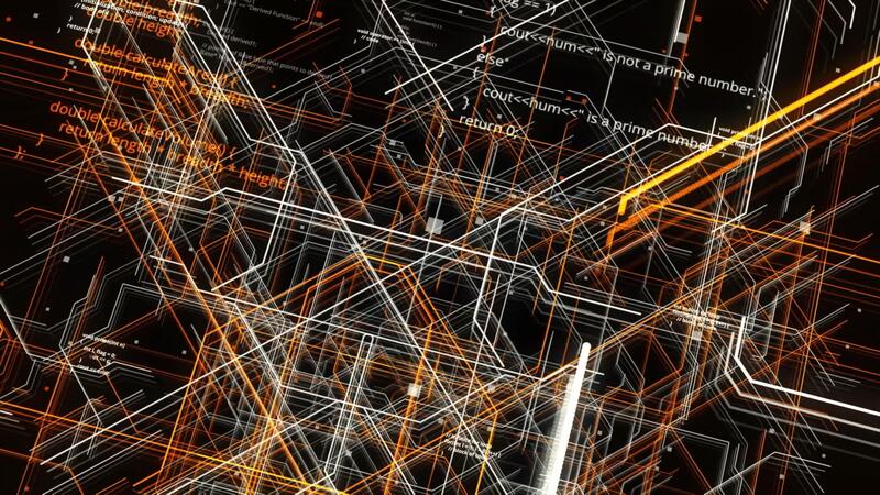 Abstract conceptual background with neuron data information and network connections. Animation. Crossing orange and white lines and program code. Pro Video