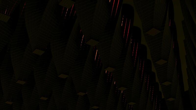 Abstract background with many rows of cone shaped pillars with cut top and red light flares. Design. Field of 3D striped columns. Pro Video