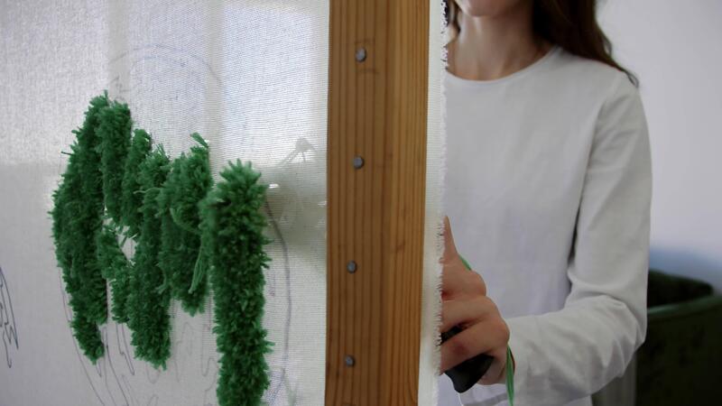 With the help of a needle, a factory worker pierces the fabric and creates a pattern for the future carpet, which is then manually produced. Medium shot. Slow motion. 4k. Pro Video