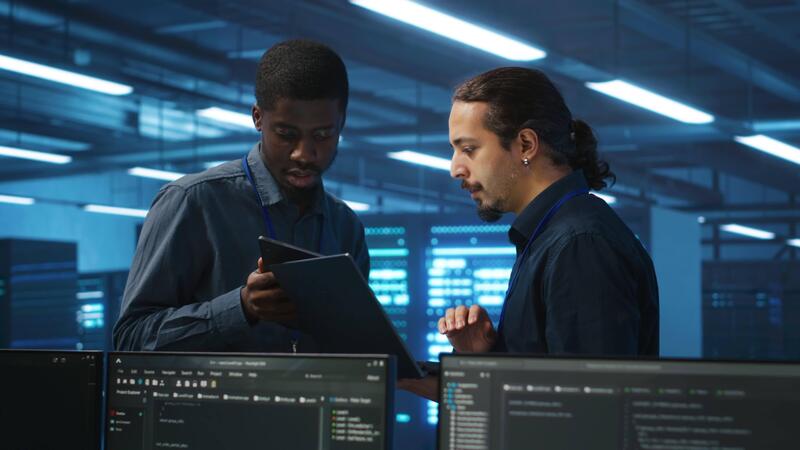 Coworking system administrators in server hub monitoring data center energy consumption across hardware using tablet. Colleagues inspecting supercomputers, ensuring malfunctions are fixed Pro Video