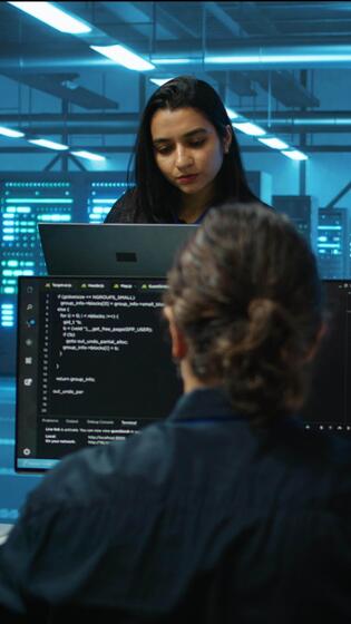 Vertical Smiling admin in server hub checking recovery plan, monitoring data center energy consumption across components, making sure sensors are functioning optimally, doing routine disk checks Pro Video