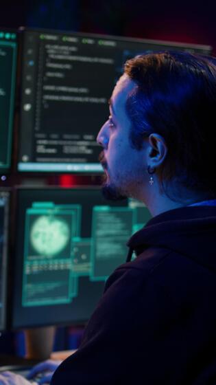 Vertical Hacker drinking coffee while running artificial intelligence spyware software designed to gather information from users. Script kiddie doing illegal stuff using AI, consuming beverage, camera B Pro Video