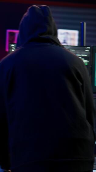 Vertical Hacker arriving in hidden underground shelter with laptop, prepared to launch malware attack on websites. Scammer in apartment starting work on dangerous script that can breach security, camera B Pro Video