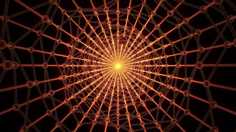 Flying through a hot tunnel made of bright spheres and plexus of glowing lines on a shiny dark background. 3D animation of abstract structure for visualization of modern technology. 4k , 60 fps Pro Video