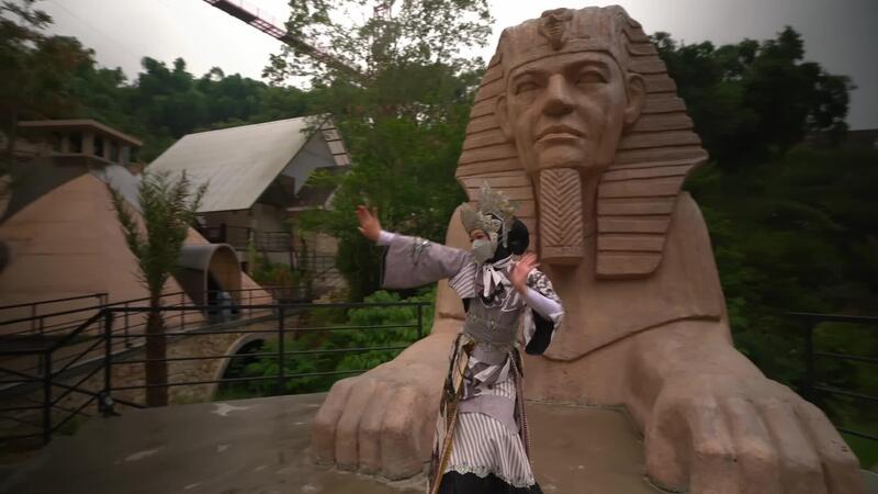A person in a patterned outfit stands in front of a large sphinx statue with lush greenery in the background, creating a unique juxtaposition Pro Video