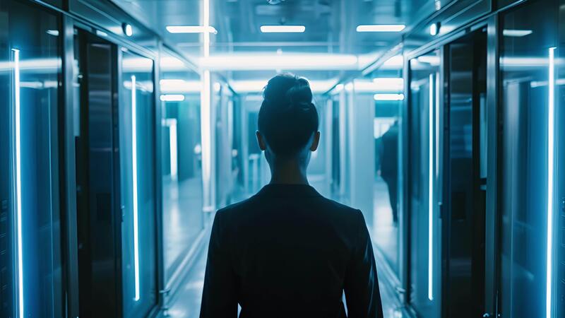 An employee entering a secure room filled with hightech machinery suggesting the use of biometric neural security systems in a workplace setting. Pro Video