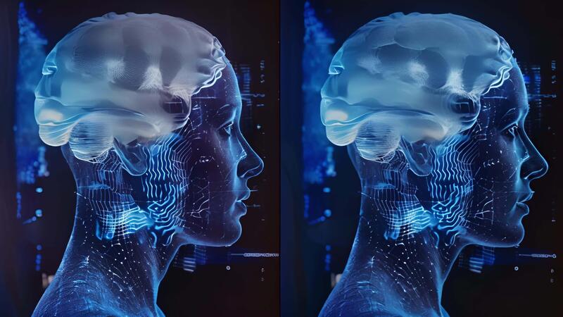 A splitscreen image showing a persons brain waves before and after using the neural enhancement device displaying significant improvement. Pro Video