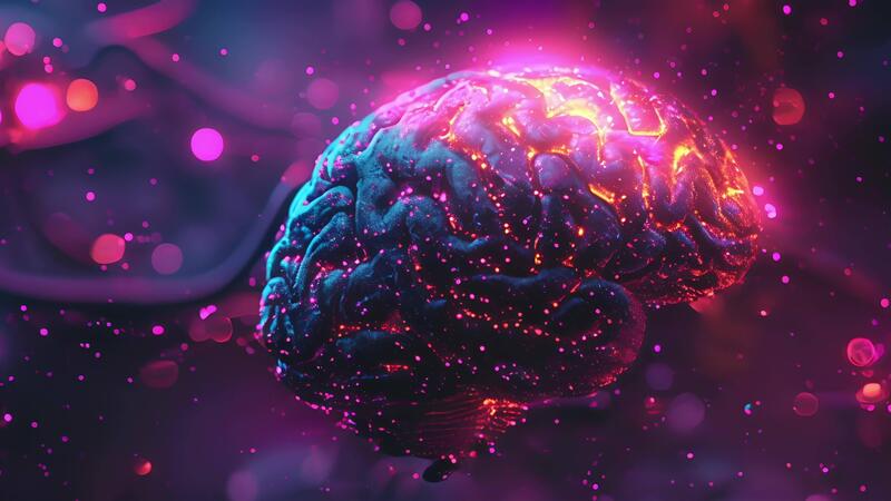 An artistic interpretation of a human brain but instead of a grey mass it is a colorful mosaic of interconnected glowing synapses. Pro Video