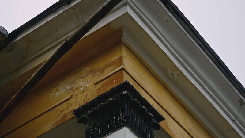 Building residence facade in classical style of architecture. Stock footage. Low angle view of old facade of a building with columns. Pro Video