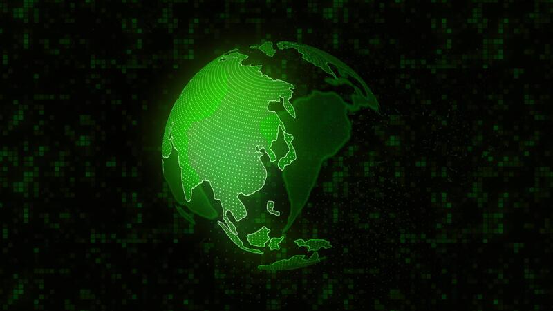 Color hologram of planet earth. Motion. Virtual hologram of planet on black background with pixels. Model of rotating earth in cyberspace Pro Video