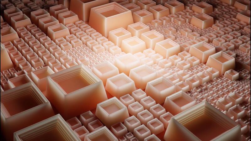 Abstract surface with plastic 3D shapes, seamless loop. Design. Flying above small and big truncated pyramids hollow inside of light orange color. Pro Video