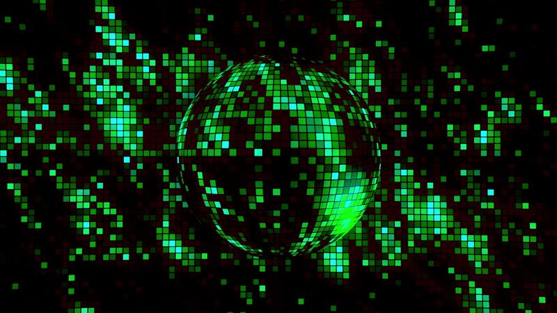 Abstract green and black pixelated background with the silhouette of a rotating sphere. Motion. Shimmering pattern of colorful particles, seamless loop. Pro Video