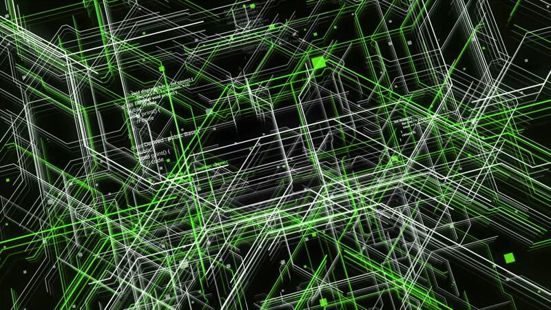 Artificial intelligence creating connections of white and green colors, seamless loop. Animation. Abstract code lines among moving green and white stripes. Pro Video