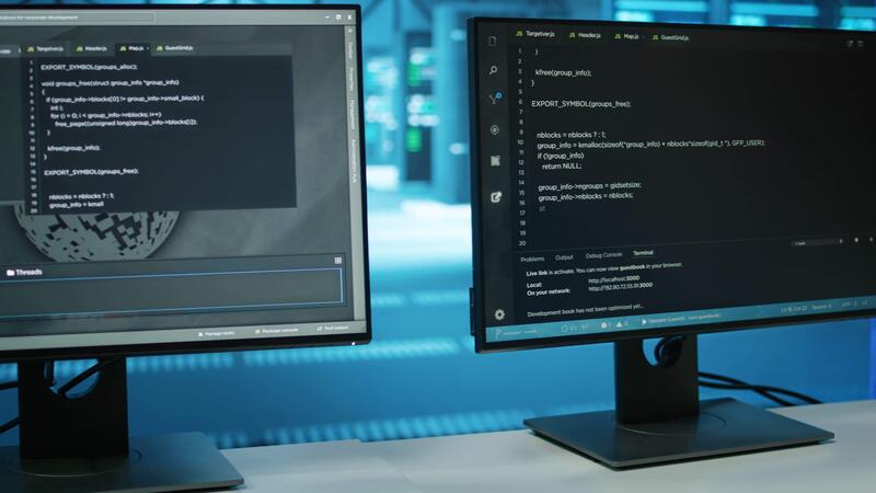 Computers in empty data center facility managing rackmounts energy consumption. Close up of script on PC monitors used for automation and monitoring processes in server room, camera A Pro Video