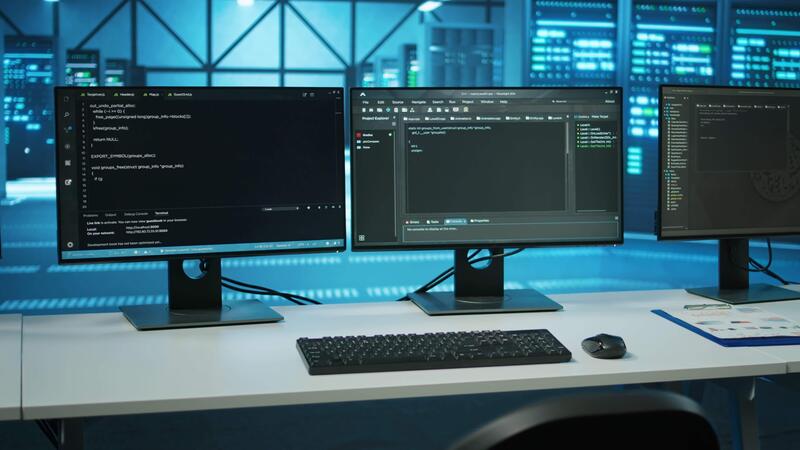 Lines of code running on computer screens in data center, used for troubleshooting rackmounts in server rows. Close up shot of script working on PC monitors upgrading hardware Pro Video
