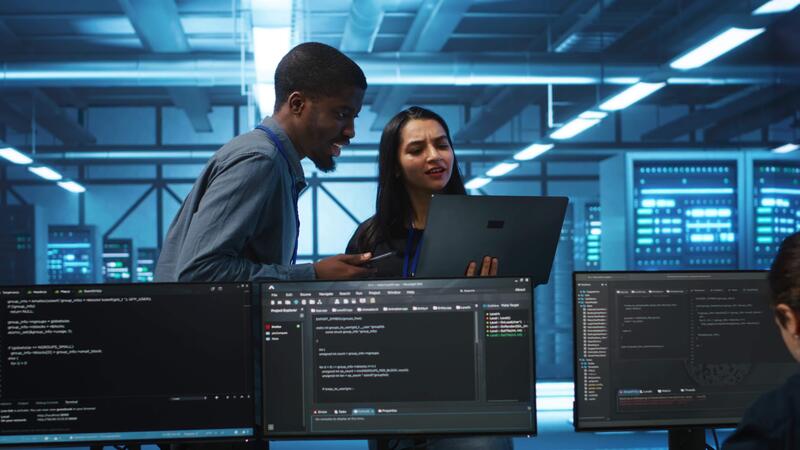 Technician and team leader in server farm looking for equipment misconfigurations affecting performance. Multiethnic coworkers checking data center infrastructure bottlenecks leading to glitches Pro Video
