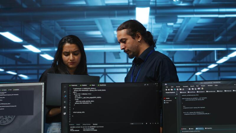 Developer in server hub using laptop to present manager plan of repairing equipment storing datasets. Specialist uses notebook to explain team leader ways of fixing rigs doing computational operations Pro Video