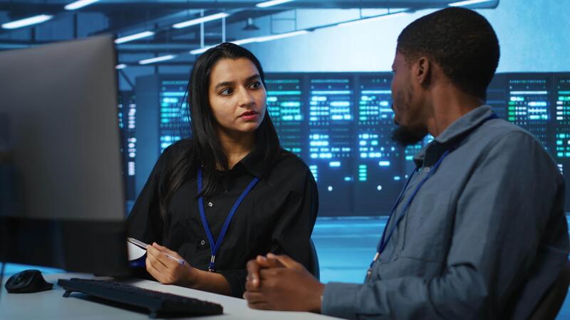 Coworkers in data center looking over annual systems review documents, discussing about parameters. Colleagues doing brainstorming in high tech workspace, talking about server clusters specs Pro Video