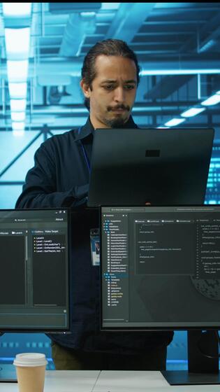 Vertical Smiling admin doing yearly checkup to prolong data center electronics life span and avoid downtime. Upbeat employee in server room monitoring server infrastructure components using laptop Pro Video