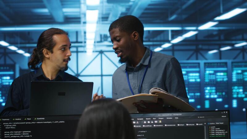 African american inspector investigating server hub, reading paperwork and evaluating parameters. Supervisor doing inspection in data center, checking reports and analyzing hardware performance Pro Video
