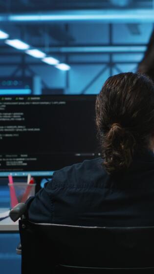Vertical Person with paraplegia working in inclusive workplace typing data on PC, doing needed adjustments in supercomputers server hub housing advanced data storage infrastructure Pro Video
