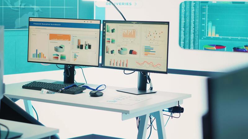Empty telecommunications company control and monitoring room, coworking space equipped with multiple workstations and a big screen to follow organizational progress and growth. Camera A. Pro Video