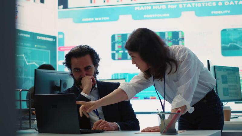 Business associate presents daily tasks order to enterprise administrator, discussing about funding and resources allocation in order to expand globally. Company analysts collaborate. Camera A. Pro Video