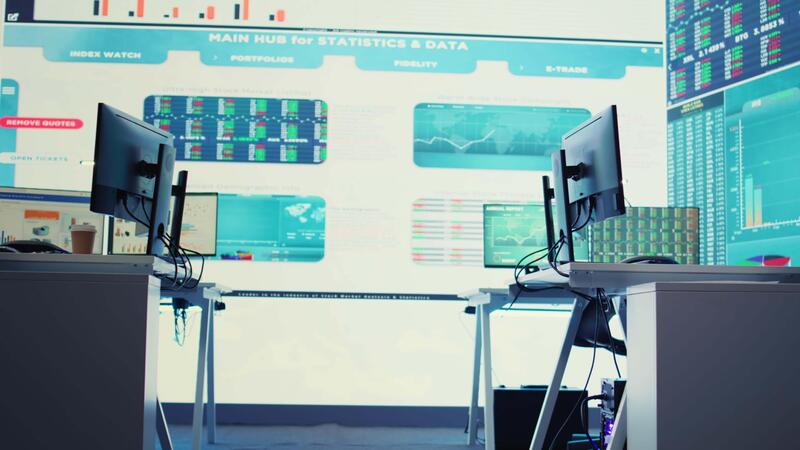 Professional enterprise headquarters equipped with big data screen and multiple computers, business coworking space. Empty startup office used by employees to examine project statistics. Camera B. Pro Video
