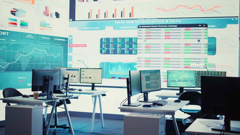 Empty telecommunications company system control and monitoring room, coworking space equipped with a big screen to follow and monitor enterprise statistics or progress. Camera B. Pro Video