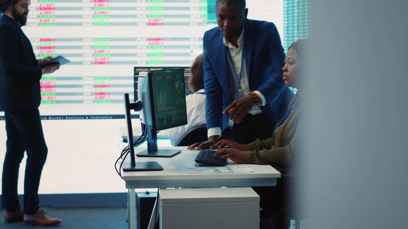 Business associates evaluating key performance indicators within the company, conducting evaluations and discussing workflow situation. Workers enhancing productivity and efficiency. Camera A. Pro Video