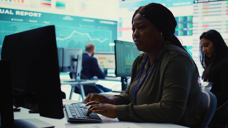 Enterprise manager analyzes annual reports and statistics on a pc, works on creating business strategies and goals. Analyst studying market dynamics and organizational progress. Camera B. Pro Video