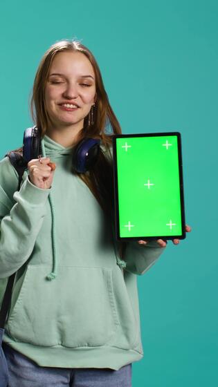 Vertical Portrait of woman presenting tablet with chroma key display, isolated over studio background. Young girl creating promotion with blank copy space mockup digital device, camera B Pro Video