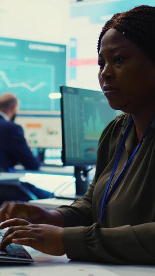 Vertical Enterprise manager analyzes annual reports and statistics on a pc, works on creating business strategies and goals. Analyst studying market dynamics and organizational progress. Camera B. Pro Video
