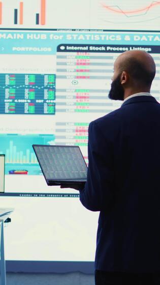 Vertical General director employing big data to help in solving tasks in control room, operating on huge screen to create a performance metrics analysis. Manager ensuring organizational efficiency. Camera B. Pro Video
