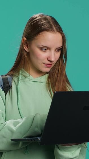 Vertical Joyful woman adding payment method on website using laptop, enjoying sales period, studio background. Girl doing purchases on internet, typing credit card information on notebook, camera A Pro Video