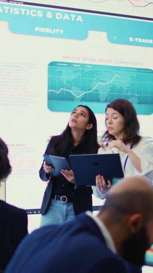 Vertical Coworkers team analyzing infographics to provide solutions on an issue affecting the project, looking to finish tasks before deadline. Business employees working together to ensure progress. Camera B. Pro Video