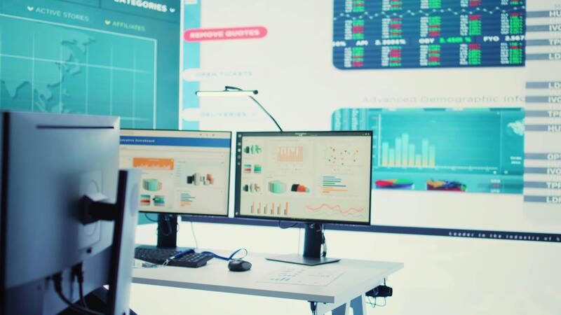 Empty boardroom space with multiple workstations having computers to solve daily business tasks and achieve organizational goals. Enterprise office with big screen for workflow management. Camera B. Pro Video