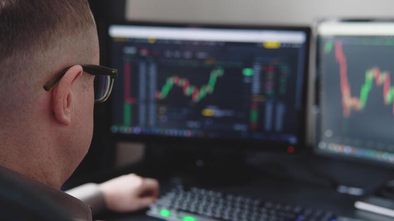 Trader wearing eyeglasses sitting at desk at office monitoring cryptocurrency chart looking at monitors analyzing candle bar price flow touching chin concerned trading concept close-up Pro Video