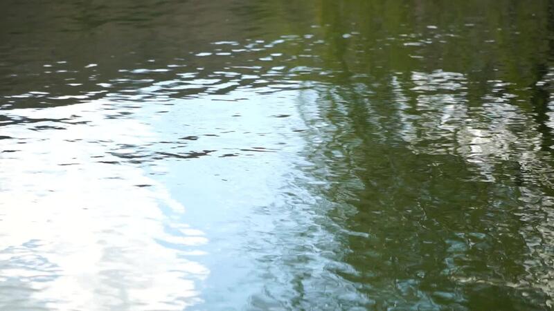 ripples on the water surface with reflection of branches of weeping willow tree and fresh green spring goslings shaking in wind, over blue lake water, creating a serene and tranquil scene. slow motion Pro Video
