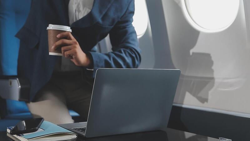 Side view portrait of handsome bearded businessman working while enjoying flight in first class, copy space Free Video